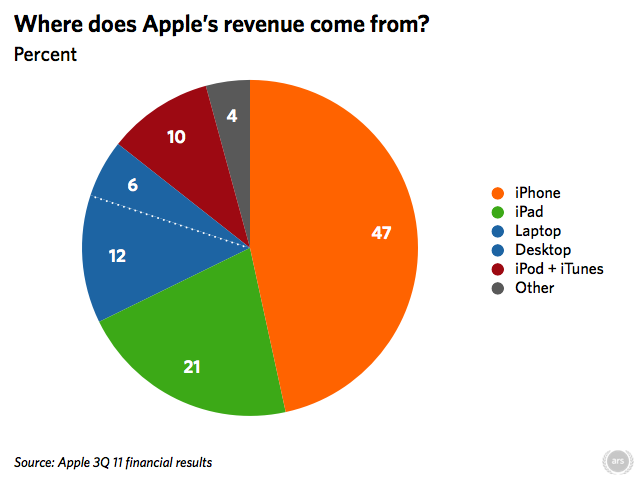 È diventato addirittura stucchevole ripetere che la fetta maggioritaria dei profitti di Apple oggi, proviene da un prodotto che 5 anni fa non esisteva, iPhone (2007). iPad, lanciato nel 2010, porta già più soldi del Mac e nel complesso, assieme a iPhone, vale 2/3 delle revenue di Apple.