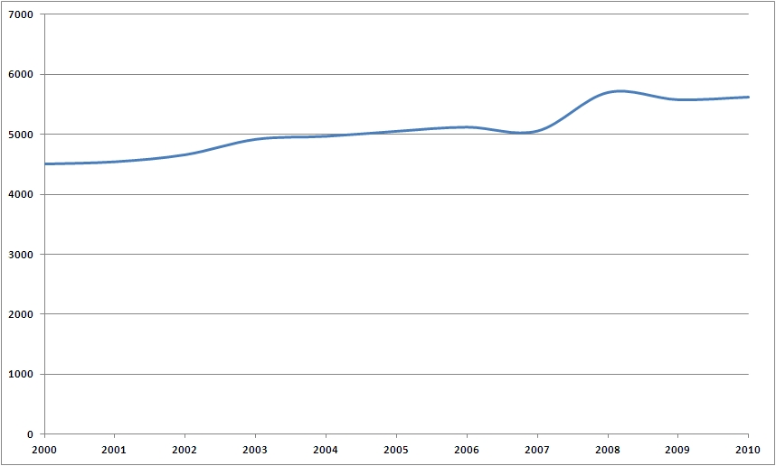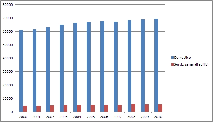 Da questo diagramma si può valutare come anche tale quota presenti un sostanziale incremento tra il 2000 ed il 2010, anche se come detto sempre in precedenza, caratterizzato principalmente da due incrementi consistenti localizzati a cavallo degli anni 2002 – 2003 e degli anni 2007 – 2008, anno quest’ultimo al termine del quale si è assistito ad un lieve calo e dalla successiva stabilizzazione del dato di consumo.