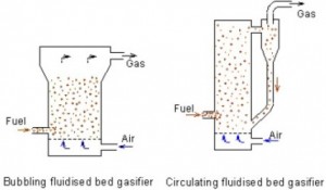 I gassificatori a letto fluido consistono invece in una sospensione del combustibile e del comburente in un letto di sabbia, mentre i gassificatori a letto trascinato operano impiegando reagenti nebulizzati ed ossigeno (od aria) in regime di equicorrente.
