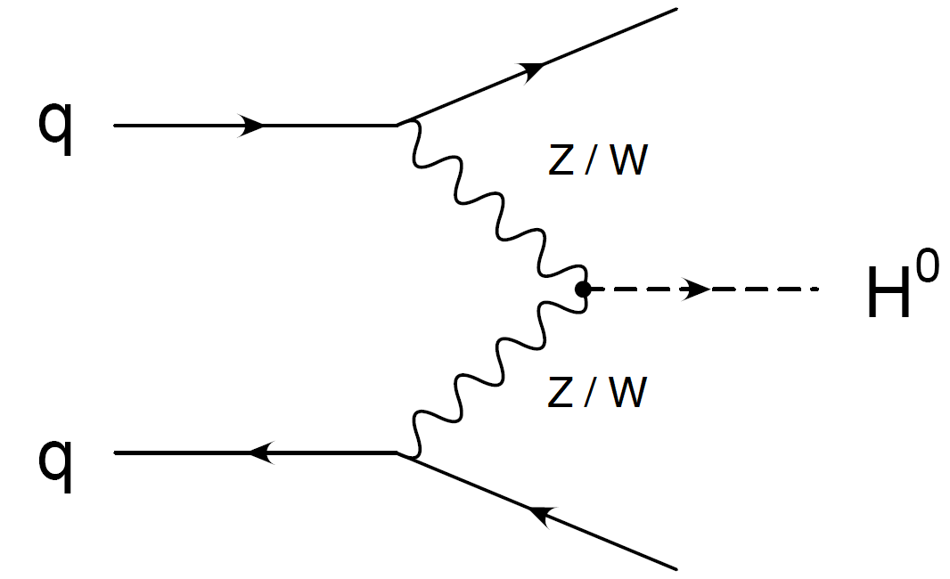in questo caso, due quark provenienti dai protoni accelerati interagiscono tra loro, generando due bosoni “vettoriali”, ovvero o il W o lo Z. Questi due bosoni poi si fondono assieme dando luogo al bosone di Higgs. Questo processo diventa importante per masse del bosone di Higgs superiori a 100 GeV. Se sentirete parlare di questo processo, al seminario di domani, credo che un punto sia particolarmente interessante. In questo meccanismo, il bosone di Higgs è accompagnato da due jet adronici, ovvero i due quark che danno inzio al processo, accanto ai bosoni W/Z, producono anche una cascata di altre particelle pesanti, che vengono emesse ad angoli molto piccoli rispetto al fascio di protoni. Questa caratteristica rende il processo più facilmente identificabile, nel mezzo del chaos di particelle che abbiamo ogni qualvolta i due fasci di protoni si incontrano.