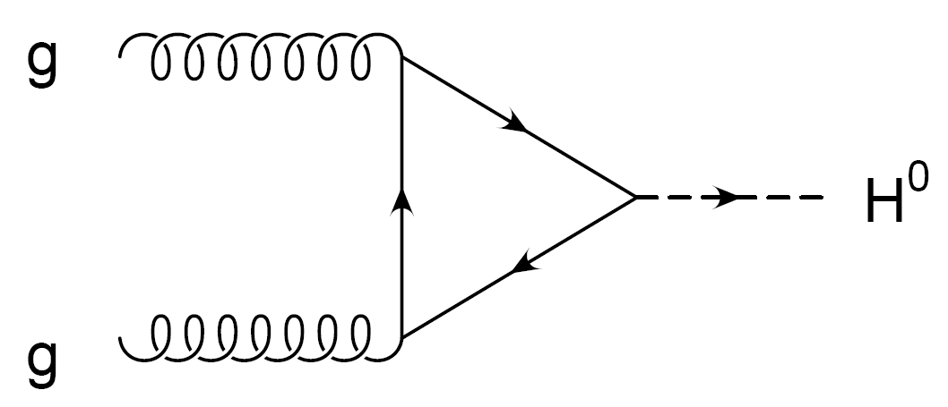 In questo meccanismo i due gluoni provenienti dai protoni che si scontrano nell’LHC si fondono assieme, tramite un “loop” rappresentato dal triangolo centrale, ovvero una produzione circolare di quark “top”, il quark più pesante di tutti, che domina il processo in quanto è favoreggiato nella sua interazione con l’Higgs.