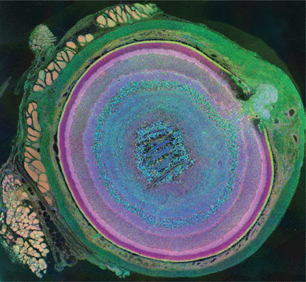 La forma più facile da capire è senz’altro la fotografia, anche se in questo capo le foto diventano delle vere composizioni artistiche. Il primo premio, infatti, è stato aggiudicato da uno scienziato di neurologia dell’università di Salt Lake City. La sua opera è consistita nell’affettare il bulbo oculare di un topo in 120 fettine più sottili di un nanometro. Ha poi evidenziato con diversi colori i vari componenti dell’occhio tramite anticorpi specifici, permettendo così di capire a cosa serve ogni zona del bulbo oculare: cellule muscolare, tessuto sclerale, e via dicendo. Vediamo qui sotto il risultato: