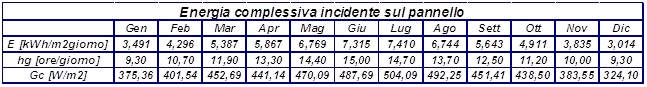 Introducendo l’indice di serenità medio mensile (indicato con K) si può valutare l’effettiva energia mediamente ricevuta giornalmente sul pannello (la tabella è stata riportata nell’ultimo post linkato – il parametro TEXT m.m. rappresenta la temperatura esterna media mensile, qui non utilizzato)