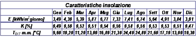 Introducendo l’indice di serenità medio mensile (indicato con K) si può valutare l’effettiva energia mediamente ricevuta giornalmente sul pannello (la tabella è stata riportata nell’ultimo post linkato – il parametro TEXT m.m. rappresenta la temperatura esterna media mensile, qui non utilizzato)