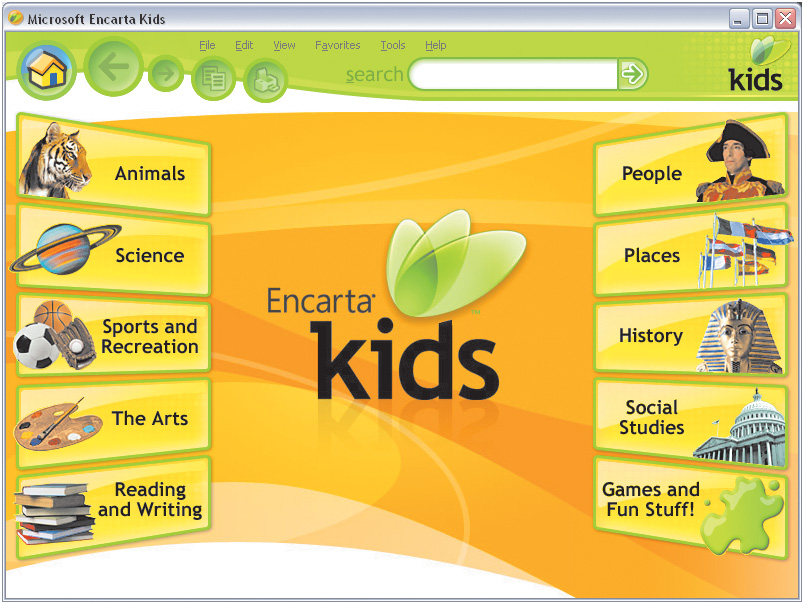 Tornando invece ad Encarta, è doveroso ricordare che nel corso della sua evoluzione l’offerta base si arricchisce di serie di soluzione specialistiche: da Encarta Atalante (Atlas) a Encarta Kids, pensato per essere utilizzato come strumento di apprendimento dai più piccoli. Inoltre nel 2000 Microsoft tenta la strada del Web con Encarta Online accessibile in versione full a fronte di un abbonamento mensile.