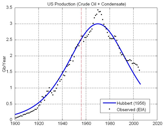Come già detto Hubbert riuscì a prevedere il picco della produzione del petrolio degli Stati Uniti applicando il modello da lui sviluppato, e si può vedere questo risultato nel seguente diagramma: