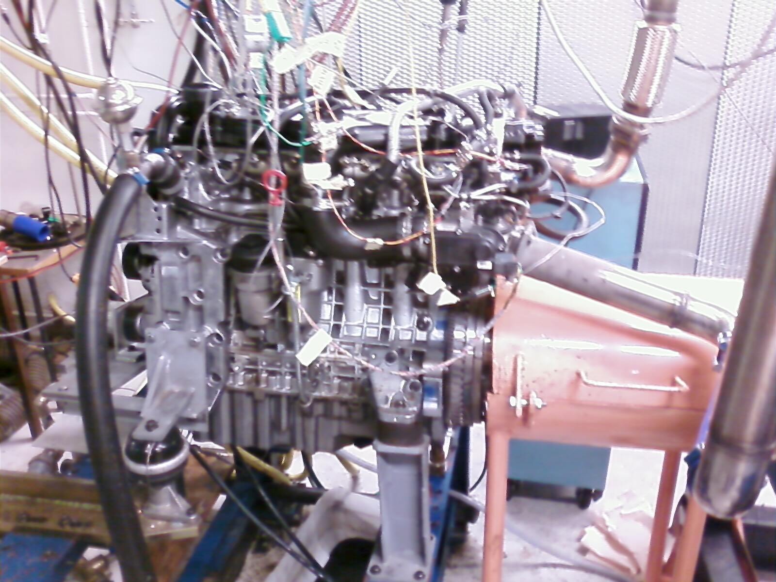 Il motore immortalato in figura è un Volvo D5 utilizzato nelle vetture della casa automobilistica Svedese, e come si può vedere esso è collegato ad una macchina elettrica (in questo caso si tratta proprio di un motore/generatore elettrico standard prodotto da ABB e non da una soluzione specifica per sale prova) e dispone di una quantità innumerevole di connessioni elettriche che costituiscono l’elevata sensoristica installata (sensori di pressione, temperatura, ecc collocate in varie parti del motore).
