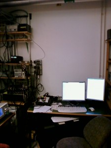 A parte l’immancabile disordine e l’onnipresente tazzona per il caffè (caffè… ehm… non esageriamo) si iniziano ad intravedere un minimo di attrezzature, compreso il primo monitor (in quel caso utilizzato per visualizzare le emissioni rilevate dall’analizzatore dei gas di scarico).