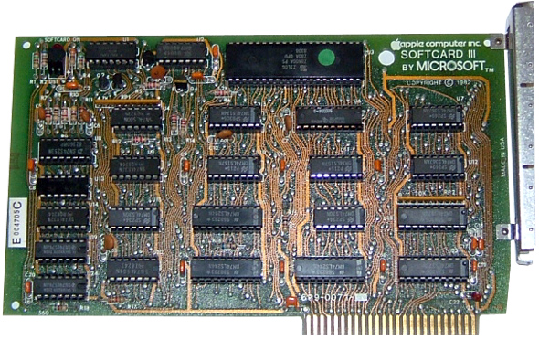 Quello che probabilmente è meno noto, è l’impegno profuso da Microsoft (durante gli anni ’80) nella realizzazione di kit di espansione, sia per il mondo Apple che per il mondo PC. Capostipite di tali soluzioni è stata l’ottima SoftCard per l’Apple II, lanciata proprio nel 1980 e partorita da un’idea di Paul Allen. SoftCard venne sviluppata con la Seattle Computer Products e, in particolare, con Tim Paterson, autore del Q-DOS poi trasformato in PC-DOS da Microsoft. La scheda è basata su CPU Zilog Z80 permettendo così di eseguire sul sistema della Mela il CP/M ed i relativi software, cosa non da poco visto che l’OS di Digital Research era la piattaforma di riferimento tra la seconda metà degli anni ’70 e i primi anni ’80.