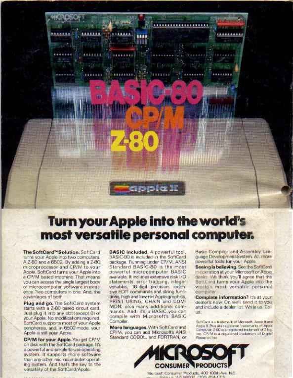 Quello che probabilmente è meno noto, è l’impegno profuso da Microsoft (durante gli anni ’80) nella realizzazione di kit di espansione, sia per il mondo Apple che per il mondo PC. Capostipite di tali soluzioni è stata l’ottima SoftCard per l’Apple II, lanciata proprio nel 1980 e partorita da un’idea di Paul Allen. SoftCard venne sviluppata con la Seattle Computer Products e, in particolare, con Tim Paterson, autore del Q-DOS poi trasformato in PC-DOS da Microsoft. La scheda è basata su CPU Zilog Z80 permettendo così di eseguire sul sistema della Mela il CP/M ed i relativi software, cosa non da poco visto che l’OS di Digital Research era la piattaforma di riferimento tra la seconda metà degli anni ’70 e i primi anni ’80.