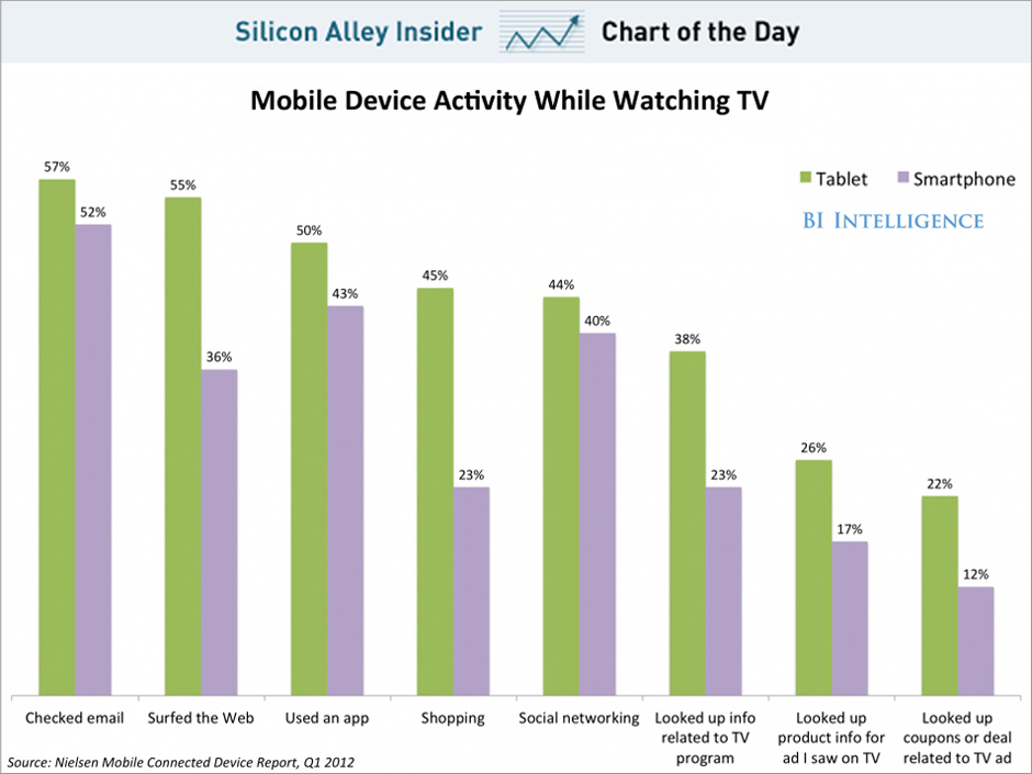 Il grafico qui sopra, elaborato da Business Insider, inquadra l’uso correlato alla programmazione televisiva come un trend non trascurabile. Se infatti le prime quattro attività sono parallele alla TV, ossia le sottraggono attenzione, le ultime quattro la completano sinergicamente, arricchendo l’informazione e dando all’interesse dell’utente rispetto a quanto mostrato. Uno sbocco del tutto nuovo, che sta lentamente ristrutturando il nostro modo di fruire dei mass media e in parte sovvertendo il modello broadcast.