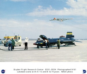 (North American X-15 dopo l’atterraggio sul lago salato ed il Boeing B-51 “Stratofortress” che sorvola l’area)