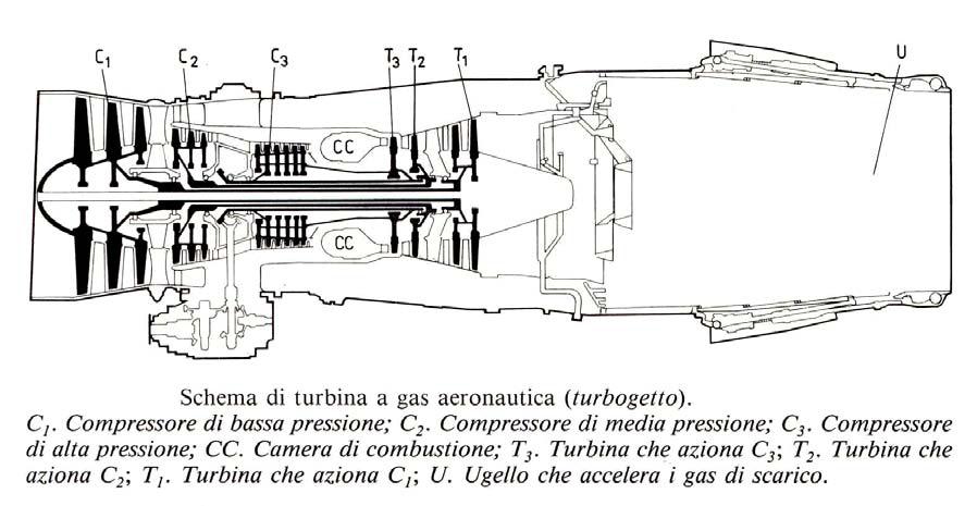 (Schema di un Turbogetto con turbina e compressore su più assi)