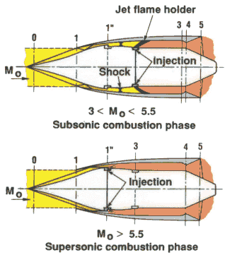 Parlando del Ramjet era stato evidenziato che tale motore permette un funzionamento efficiente tra una velocità relativa (rispetto al flusso d’aria) minima sufficientemente elevata (e comunque mai uguale a zero) ed una massima dell’ordine di Mach 6, valore al di sopra del quale diventa problematico decelerare il flusso al di sotto della velocità supersonica per la combustione e riuscire ad ottenere un flusso di gas combusti a velocità superiore a Mach 6 a causa della caduta di pressione totale che la decelerazione comporta.