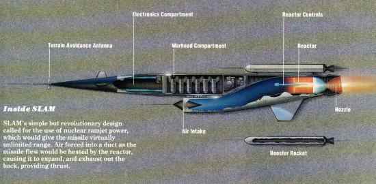 Se il periodo della Guerra Fredda ha prodotto una grande mole di studi e test sulle applicazioni dell’energia nucleare in campo militare, tra di essi è sicuramente degno di nota il Progetto SLAM – Supersonic Low Altitude Missile (definito nel 1957) nell’ambito del quale veniva richiesto dall’USAF lo sviluppo di un missile dalle caratteristiche davvero particolari, ovvero la capacità di volare a bassa quota seguendo una traiettoria guidata (caratteristiche che lo inquadrano come “Missile da Crociera“) a velocità supersonica, ma soprattutto di essere propulso da un inedito statoreattore a propulsione nucleare.