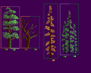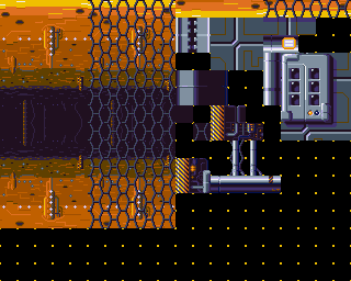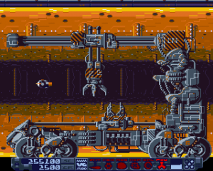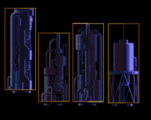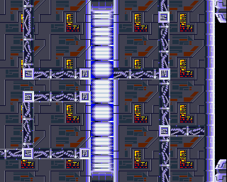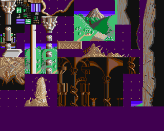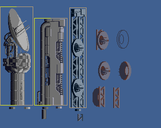 Cercavamo di usarli frugalmente per non affollare troppo il campo visivo ed erano fatti di uno o due hardware sprites larghi 32 pixels e di qualsiasi altezza, con quattro colori indipendenti dal resto dello schermo. L’esempio piu’ notevole e visto e’ quello dell’antenna parabolica in City ma ce ne sono altri in Ruins e Factory; inoltre molti dei proiettili erano sprites con la loro palette di quattro colori indipendente.
