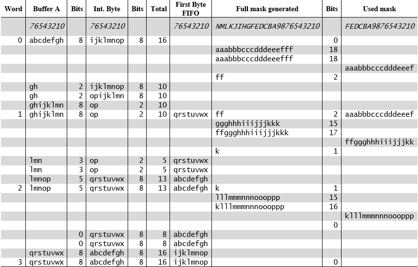 Infine la terza Word (#2) chiude il cerchio, poiché anche in questo caso vengono prelevati 5 bit (lmnop) e generata una maschera di 15 bit (lllmmmnnnoooppp), ma adesso nella precedente maschera è rimasto un solo bit (k) e, dunque, risulteranno presenti esattamente i 16 bit necessari (klllmmmnnnoooppp), lasciando Full mask generated completamente vuota stavolta. Anche il buffer si svuota completamente, per cui in esso verrà integralmente copiato il byte interno (qrstuvwx), che a sua volta verrà rimpiazzato dal primo byte della coda FIFO (abcdefgh).