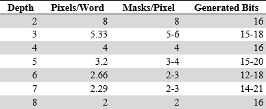 Tutto fila liscio per profondità di colore che siano potenze di due, perché consentono di generare sempre maschere da 16-bit coi bit letti dal canale A, ma per le profondità di colore che non lo siano ci sarebbero problemi (c’era da aspettarselo), poiché i bit generati sarebbero sempre o meno di 16 o più di 16 bit: non si scappa! La seguente tabella mostra la situazione precisa, per ogni profondità di colore: