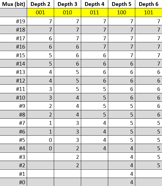 Le colonne Depth rappresentano quale bit del buffer debba essere utilizzato per la specifica linea di ingresso per quel determinato mux (riga). Le celle vuote indicano che l’uscita è forzata a zero, poiché nessun bit del buffer viene usato per quella specifica profondità di colore.