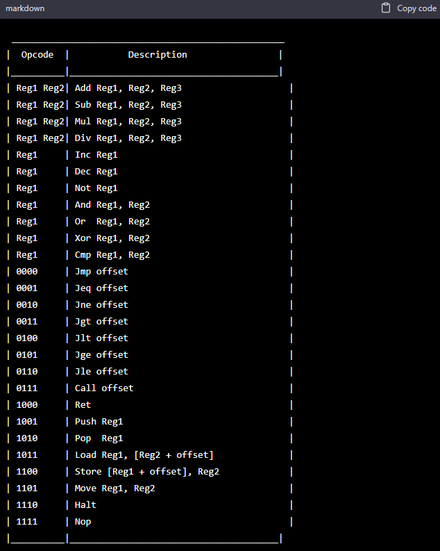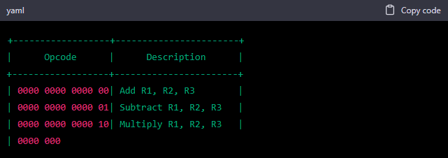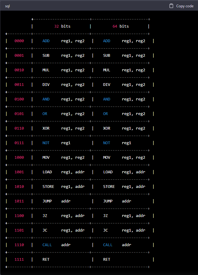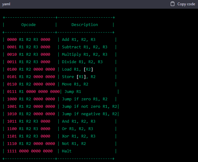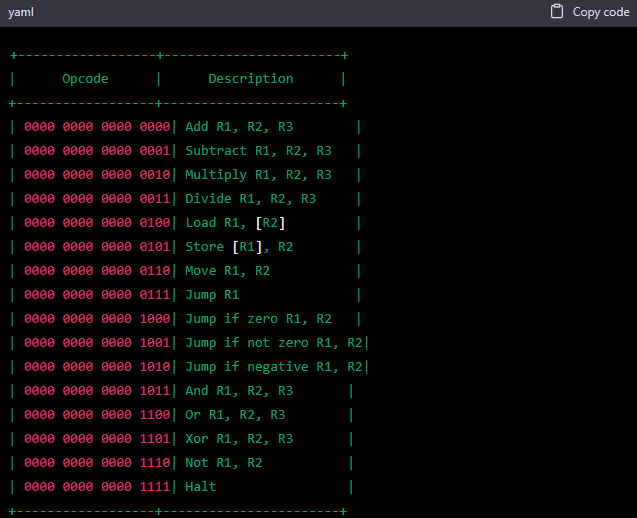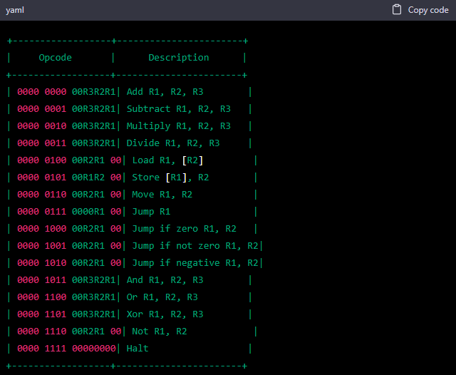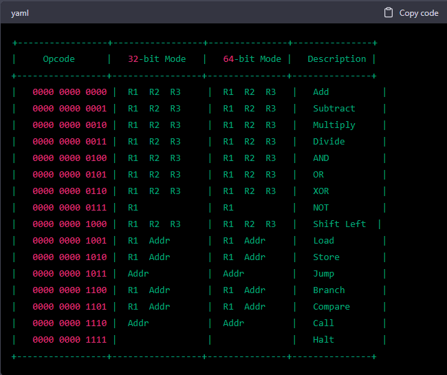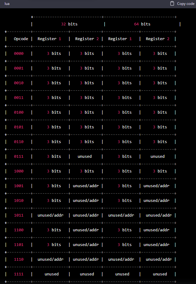 Since decades we don’t see computer architectures with such oddities, because usually (there might be exceptions on very specific niches) their information is stored on groups of bits as multiples of a power of two. That’s why I’ve asked the bot to make a correction to the last table and use opcodes of 8 or 16 bits in size.