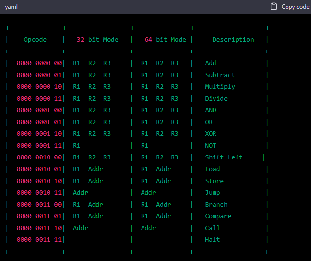 Generate an opcode table in ASCII art for a new computer architecture which supports both 32 and 64 bits execution modes. The new ISA should have, on average, a better code density according to the most popular benchmarks (SPECint, SPECfp, Embench) when compared to Motorola 68000, ARMv7, ARMv8, ARMv9, Intel x86 and AMD x86-64 architectures. It also should have, on average, less instructions executed. The above code density and executed instructions metrics should be take into account according to the static and dynamic code analysis.