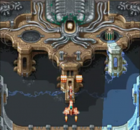 Come si può vedere da questa schermata, la torretta a destra emana una raggio che tinge di blu tutto ciò che rientra nel suo cono. Quest’effetto di trasparenza si ottiene selezionando accuratamente i colori della tavolozza, ad esempio i primi 64 coi colori che vengono utilizzati per disegnare tutta la grafica (sia il fondale sia i personaggi), mentre i successivi 64 saranno costituiti dai primi 64 ma in tonalità bluastra, per un totale di 128 colori (7 bitplane).