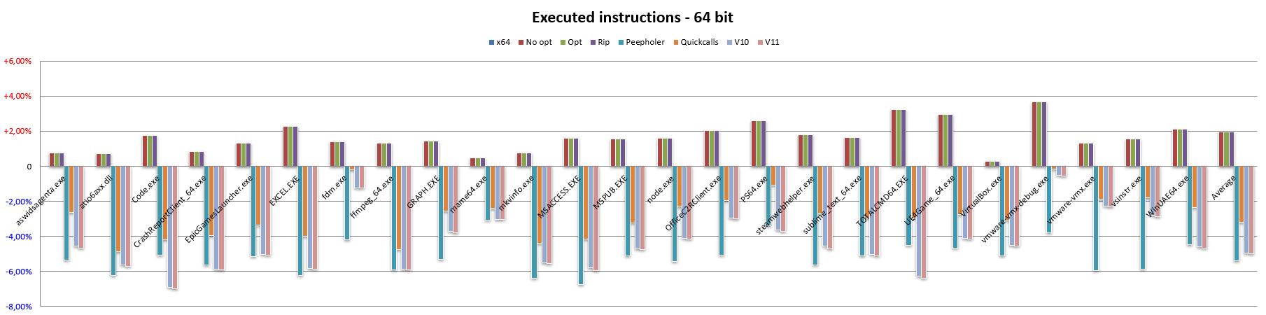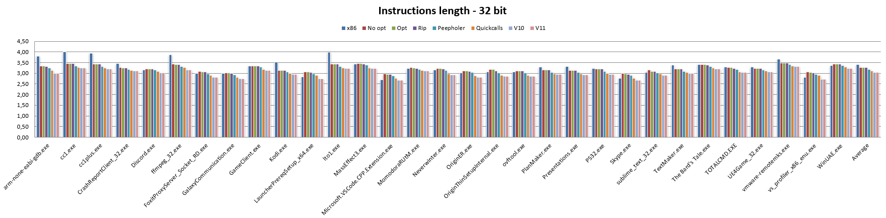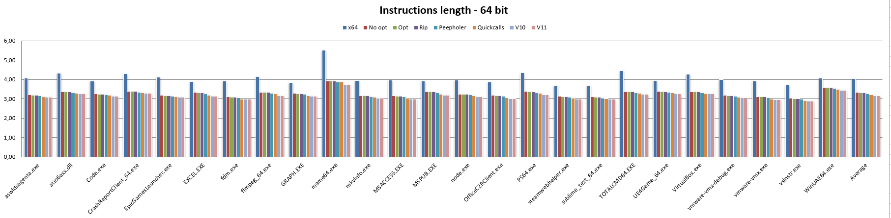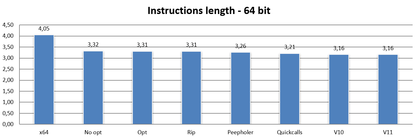 Similarly to the 32-bit code, the Peepholer bar shows a significant reduction in instruction length, and the same applies to the Quickcalls bar, although in both cases the same benefits are not achieved as observed when switching from x86 to NEx64T, while switching to v10 and v11 shows the same decreases in the respective bars as previously observed.
