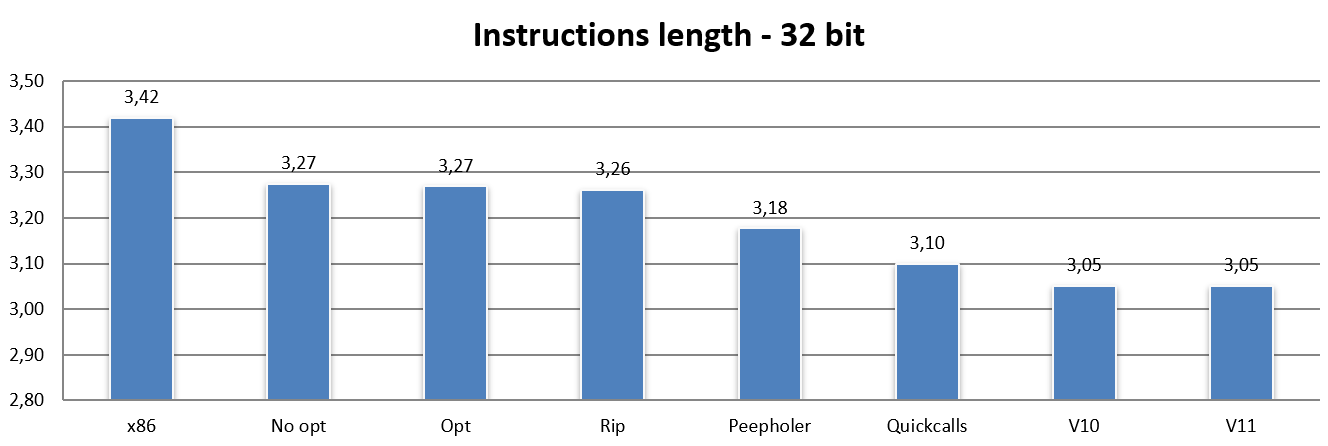 It is glaring how, in this case, the strong point is represented by instructions using opcodes of only two bytes, which account for just under half of the total, and thus weigh heavily on the contribution to the average length.