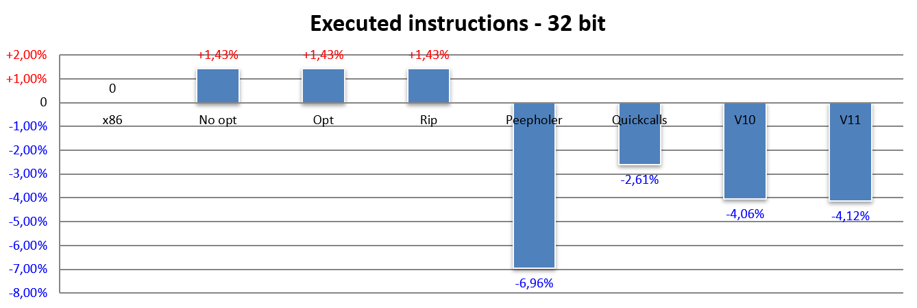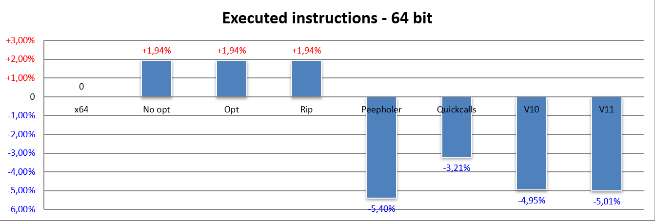 Here the thing that immediately jumps out at you is the fact that all three bars No opt, Opt and Rip report exactly the same result: an increase of just under 1.5% in the number of instructions executed. This occurs due to the more complex/legacy cases of x86, which require more than one instruction to be emulated by NEx64T.