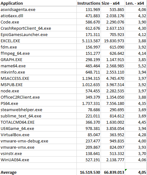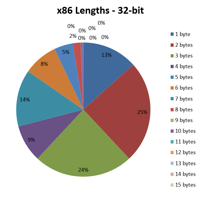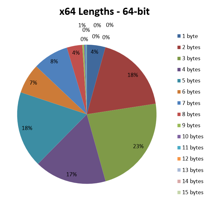 As can be seen, the lion’s share is taken by opcodes two or three bytes long, which are present in 25% and 24% of the disassembled and analysed instructions, respectively. Read another way, this means that about 50% of the instructions have an average length of 2.5 bytes.