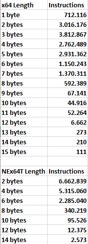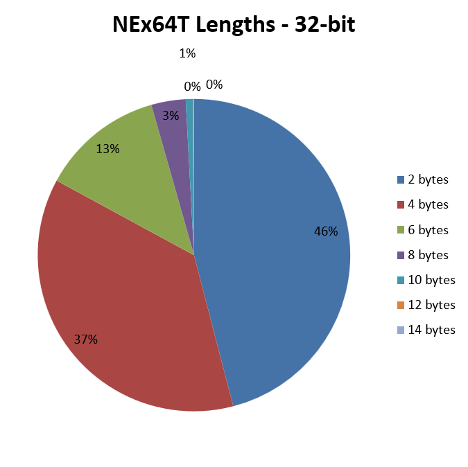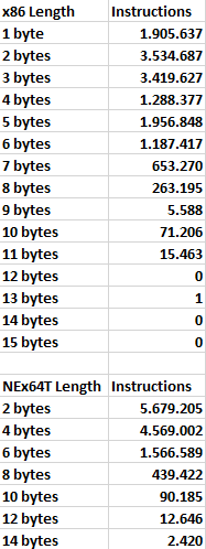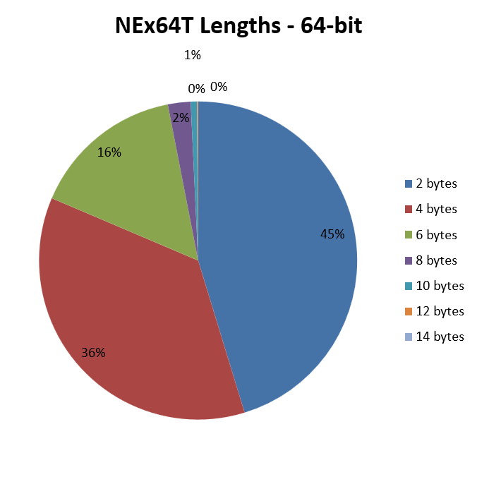 In this case, we immediately see that even the very trivial literal translation of x64 instructions into the NEx64T equivalents (or a few more, in certain more complex / legacy cases) results in a drastic reduction of the average instruction length.