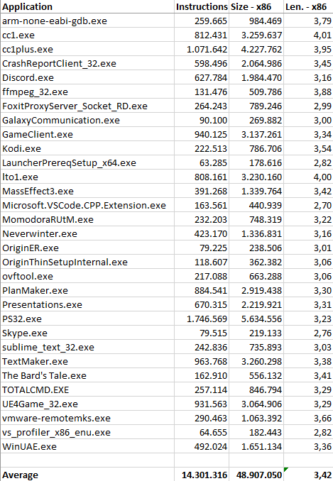 Unfortunately, it is all the other cases that remain that raise the bar, until we reach the 3.42 byte average instruction length, which is still a flattering result, for which x86 is also famous (it has a good code density, in fact).