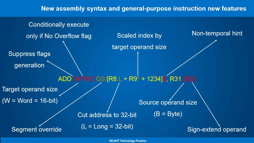 Ciò significa che istruzioni come POPCNT, che su x86 / x64 possono gestire dati soltanto di alcune dimensioni (16, 32, e 64 bit, nello specifico), possono lavorare, invece, con qualunque dimensione (quindi anche 8 bit). Un altro esempio è ADCX, che su x86 / x64 lavora soltanto con dati a 32 e 64 bit, mentre su NEx64T può farlo anche con dati a 8 e 16 bit.