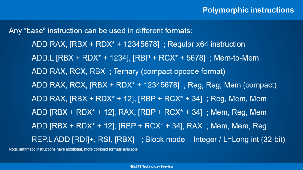 Ma… non soltanto la memoria! NEx64T, infatti, va ben oltre quanto consentito / codificato da x86 e x64, a tutto vantaggio della densità di codice, dello spazio occupato in memoria per i dati, e quindi ancora una volta con positive ricadute sulle prestazioni e i consumi…