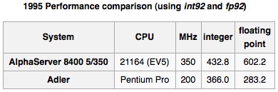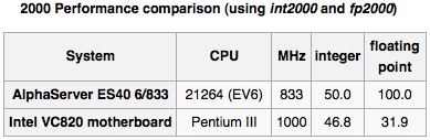 Il gap prestazionale era imbarazzante, specialmente in ambito Floating Point, dove l’Alpha era in grado di stracciare letteralmente la concorrenza con performance raddoppiate se non triplicate rispetto al meglio dell’offerta x86 (da Wikipedia):