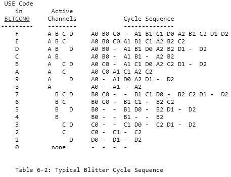 Per chiarirlo bisogna comprendere come lavora il Blitter. Ad esempio, quando deve utilizzare tutti e tre i canali per un’operazione complessa (e molto comune nei giochi o nel disegno della grafica dell’interfaccia utente), deve prima leggere dalla memoria i dati di tutti e tre, e soltanto dopo potrà usarli per l’elaborazione, producendo il dato che dovrà essere scritto (sempre in memoria).