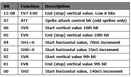 using some unused bits for this purpose: bits 3 to 6. With these four bits it would have been possible to select the four highest bits for the part of the palette to be used (which can ideally be considered divided into 16 palettes of 16 colours each). Considering that the Amiga can display sprites with a maximum of 16 colours (only 4 with OCS/ECS, but would have become as many as 16 with this innovation, since the 32 4-colour sprites can be paired two at a time to form a 16-colour sprite), the combination is perfect.