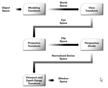 Il primo passo è quello di definire un oggetto, ad esempio un cubo o un cilindro o un bicchiere. Per farlo si adopera uno spazio detto OBJECT SPACE o MODEL SPACE, in cui ogni singolo oggetto è rappresentato con un suo sistema di coordinate. Questo significa che, ad esempio nel caso del cubo, si fissa un punto, sul cubo o interno ad esso, come origine degli assi (sarebbe opportuno scegliere un vertice o il baricentro dell’oggetto) e si utilizza tale origine per definire la posizione e le dimensioni dell’oggetto in quello spazio; questo punto si definisce anche pivot point o object origin. Se nella scena compaiono altri oggetti, si fa la stessa cosa per ciascuno di essi, prendendo come origine, di volta in volta, un punto su ciascun oggetto.