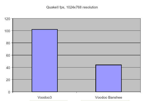 Se da un punto do vista qualitativo VSA-100 non ha nulla da invidiare ai suoi diretti concorrenti, anzi, può ad esempio, vantare un FSAA che non solo ha un’ottima qualità ma che, grazie all’adozione del T-buffer, ha un impatto prestazionale inferiore rispetto a quello visto su NV15 e R100 (per quanto sempre devastante come tutte le forme di FSAA), dal punto di vista delle prestazioni pure risulta inferiore ad entrambi, anche in modalità SLI ed inoltre, necessita di una cpu più potente per poter dare il meglio, in quanto per i calcoli geometrici si appoggia completamente su di essa. Rispetto alle rivali, ha in più le GLIDE, alternativa proprietaria alle D3D e alle OpenGL ma ormai sono lontani i tempi in cui 3dfx era sinonimo di prestazioni vertiginose in 3D. La serie Geforce, soprattutto in versione NV15, grazie al fatto che internamente supporta, nativamente, sia i calcoli a 16 che a 32 bit, nella prima modalità riesce a sfoderare prestazioni molto al di sopra dei concorrenti, seppure con una qualità a dir poco pessima. A 32 bit, invece, soprattutto in D3D, brilla R100, che effettua i calcoli interni, al pari di MGA 400 (la matrox G400), sempre a 32 bit ma riesce a gestire meglio il bus di accesso alla ram grazie all’Hyper-z, una serie di feature atte ad effettuare operazioni di HSR, di compressione dei dati e di pulizia veloce dello z-buffer.