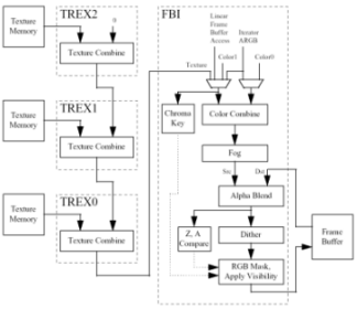 Il FBI, invece, presenta un color combiner e unità di alpha blending, dithering, color e z compare.