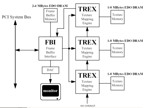 Il TREX è il chip master che si occupa di tutte le operazioni relative alle texture, tra cui il calcolo del LoD (level of detail), il mipmapping, le tecniche di filtraggio semplici (point sampling, bilinear filtering, ecc) e quelle, per l’epoca, più avanzate (trilinear  filtering, detail texture mapping e projected texture mapping). Il FBI è un chip slave, attraverso cui passano tutte le comunicazioni con il bus PCI e, di conseguenza, con la cpu. Il FBI gestisce anche le operazioni di base sulle primitive, tra cui gourad shading, alpha blending, dithering e depth buffering, svolgendo, di fatto, il ruolo che, negli attuali chip, è affidato alle cosiddette RBE o ROP’s.