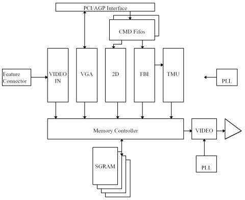 Dalla figura si può vedere che è ancora presente il FBI, come è presente un blocco denominato TMU che, stavolta, comprende 2 unità di texturing che si trovano sullo stesso chip del FBI. C’è anche, come è ovvio, il blocco relativo alle funzioni 2D.