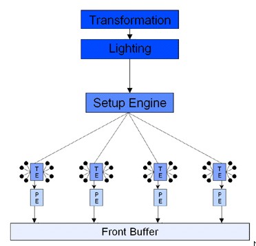 Questa architettura che è quella di NV10, chip noto come Geforce 256, nome derivante dall’adozione di un’arhcitettura interna a 256 bit, sarà modificata con l’aggiunta di una seconda tmu (o TE) per ogni pipeline, in NV15 (Geforce 2). A questo punto, ormai, nVidia ha soppiantato S3 come principale fornitore di chip a terze parti per il segmento consumer e con NV15 ha tolto a 3dfx lo scettro delle prestazioni nel 3D.