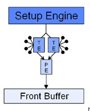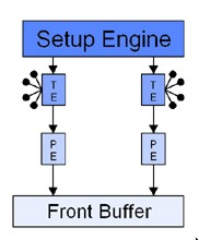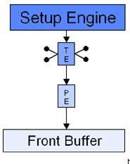 Nelle immagini, le unità indicate come TE sono le texture unit, mentre quelle indicate con PE sono l’equivalente delle attuali ROP’s, ovvero le unità che si occupano di “scrivere” i pixel. Il vantaggio di un’architettura come quella di NV4 rd NV5 è evidente: a parità di capacità di texturing, rispetto ai chip di 3dfx si ha un maggior parallelismo, ovvero, a parità di texel fillrate, si ha un maggior pixel fillrate, almeno in caso di single texturing.