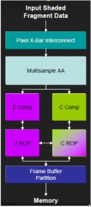 Il compito delle ROP’s è quello di “scrivere” sul frame buffer tutto ciò che le unità di shading hanno calcolato, sia a livello di gemetrie che di colori o illuminazione. Inoltre contengono il circuito che si occupa delle operazioni di resolve del MSAA box che, almeno fino alle dx10, opera ancora in INT8.
