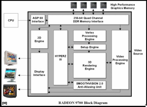 Il primo chip ad abbandonare completamente delle FF unit di tipo fisico, invece, è stato l’R300 di ATi, di cui riporto lo schema a blocchi e qualche dettaglio.