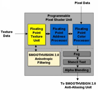 Questo schema sarà superato, a livello di flessibilità, da nVidia con NV40 e G70, di cui mostro una immagine dello schema a blocchi