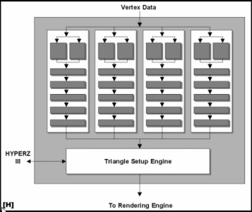 Torniamo allo schema a blocchi dell’R300, in cui segnalo un errore relativo alla connessione del blocco denominato Hyper-z III che non riceve i dati dalla VRAM ma al termine delle operazioni di vertex shading. L’hyper-z III non è altro che un insieme di feature atte ad effettuare operazioni di HSR prima del rendering e dell’eventuale applicazione del MSAA box