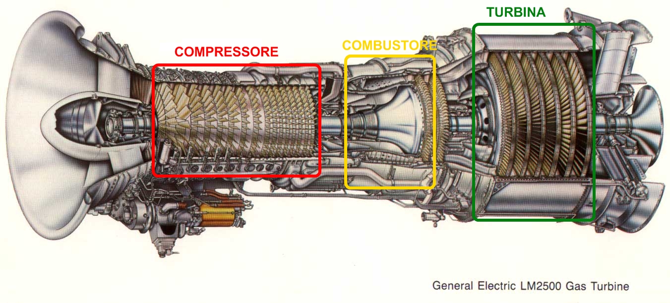 Essenzialmente sono composte da un compressore ed una turbina collegati tra loro meccanicamente, come visibile in figura, l’aria compressa viene inviata al combustore dove si miscela con il combustibile, ed i gas combusti così prodotti espandono in turbina cedendo la loro energia.