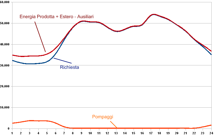 Sottraendo l’energia utilizzata per i pompaggi (e quindi per la modulazione fine, oltre che quella necessaria a ripristinare il bacino di monte) si ottiene perfettamente la curva della richiesta dell’utenza. Tra le 22 e le 7 del mattino si ha una condizione di minimo tecnico per alcuni impianti termoelettrici, e questo impedisce un ulteriore abbassamento della loro potenza per evitare problemi tecnici, oltre che di un incremento del costo per kWh prodotto essendo tale costo sensibile allo scostamento dal massimo rendimento dell’impianto.